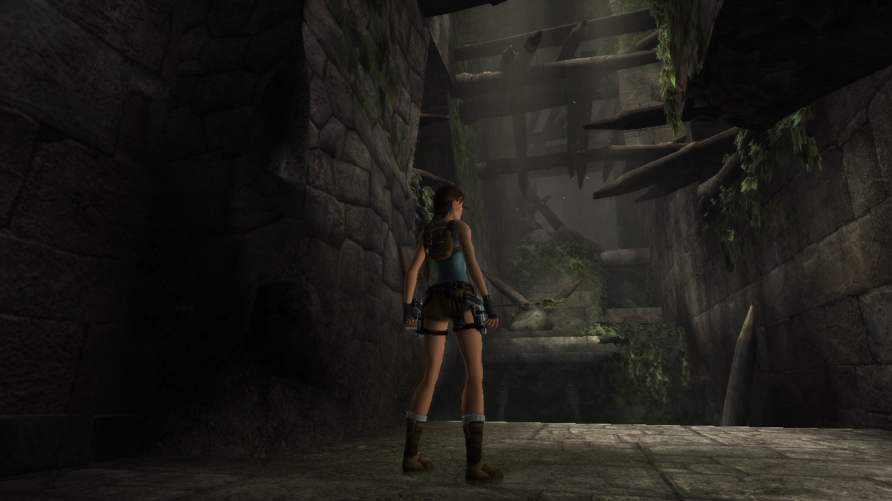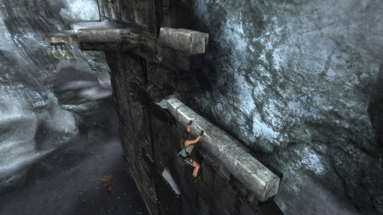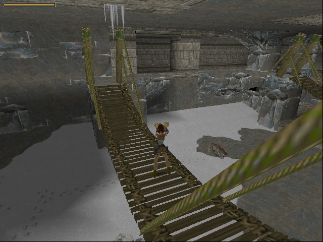 The room with the wooden bridges and wolves holds the first real surprise for series veterans: It used to be so easy to just stand on the first bridge and shoot down, but now the rotten ropes break, an Lara finds herself facing the wolves in direct combat. |