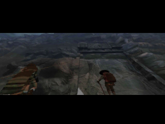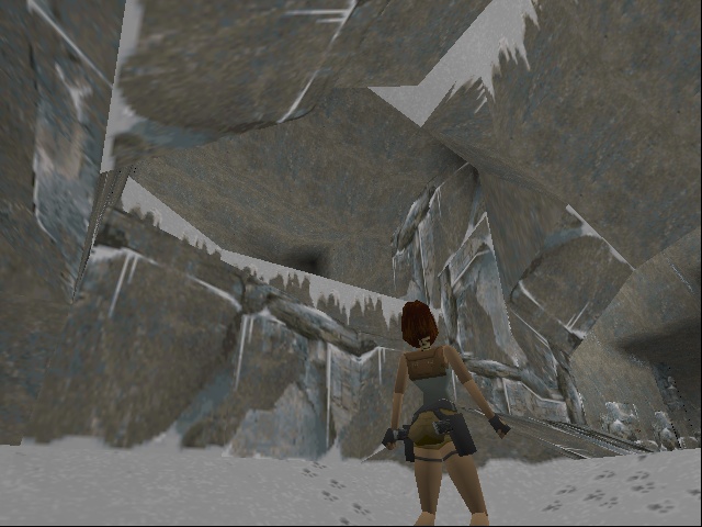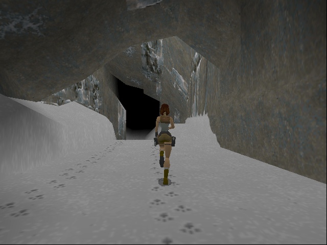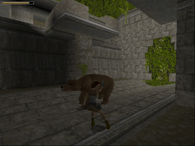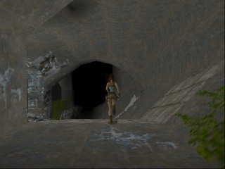 The protruding rocks at the bear's cave are gone, but someone had the courtesy to hang a rope above it for Lara to swing over to the other side. In both games it's necessary to climb down and face the bear to find a secret item, though. |