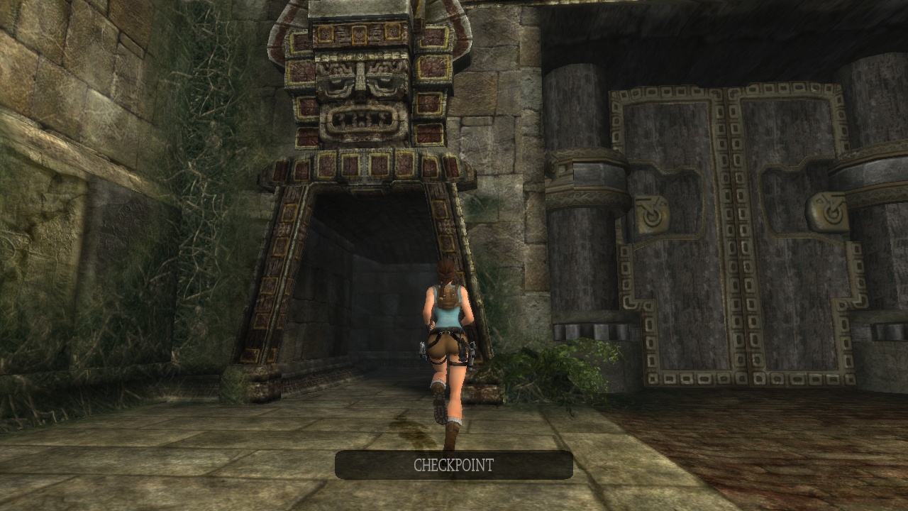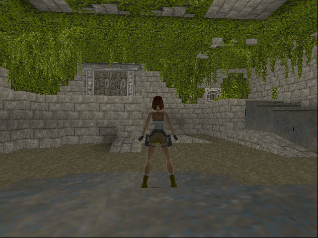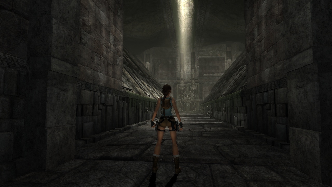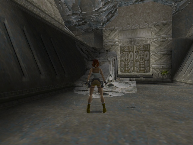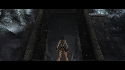The final door of the first stage. In the original Lara actually approaces it from the balcony to the left, after seeing it teased from a wooden gate that blocks the front corridor. In Anniversary the way is wide open, but instead opening the door is made more complicated: Lara has to get up to hang onto the weights that pull up the huge stone bolts that keep it locked. |