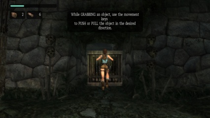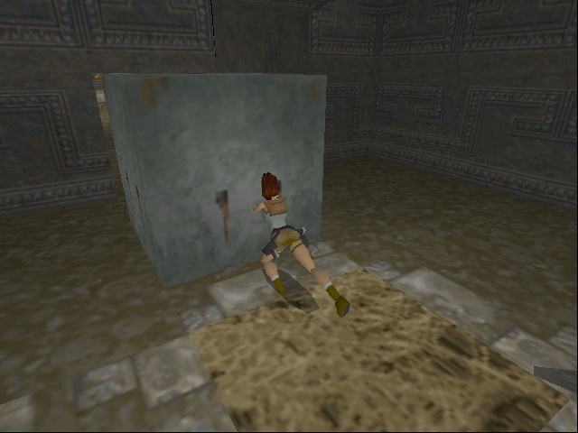 Moving around blocks is now much easier and less stiff, which is represented in the graphics by a much smaller wooden cage. Lara pushing around solid blocks of granite that are bigger than herself was a bit silly even in 1996. The remake also allows dragging it out of the building and use it to get up on the roofs. |
