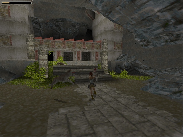 The first half of the FMV that originally shows Lara getting into the Peruvian ruin is made playable in the remake. It serves as a brief tutorial for those who skipped the Croft Mansion, introducing all the climbing mechanics. Ironically, Lara would climb the giant portal with a grappling hook which wasn't actually in the original game, but gets frequent use in the remake. |