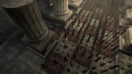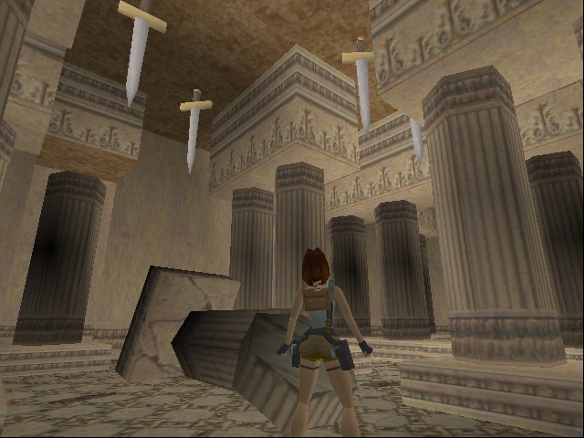 Damocles' challenge certainly was the most exciting in the old days: The ceiling is full of huge swords that just linger up there as Lara enters, but start falling down when she tries to escape with the key. While the key room itself used to be safe, the remake adds an impressive bladed chandelier just above the item. The falling swords are still there, but the center floor opts for knives coming out of the floor in intervals instead. This room is actually much less aggravating with the save everywhere mentality of the original (at least in the PC version), cause the auto save spots in the remake can get a bit annoying after a few tries. |