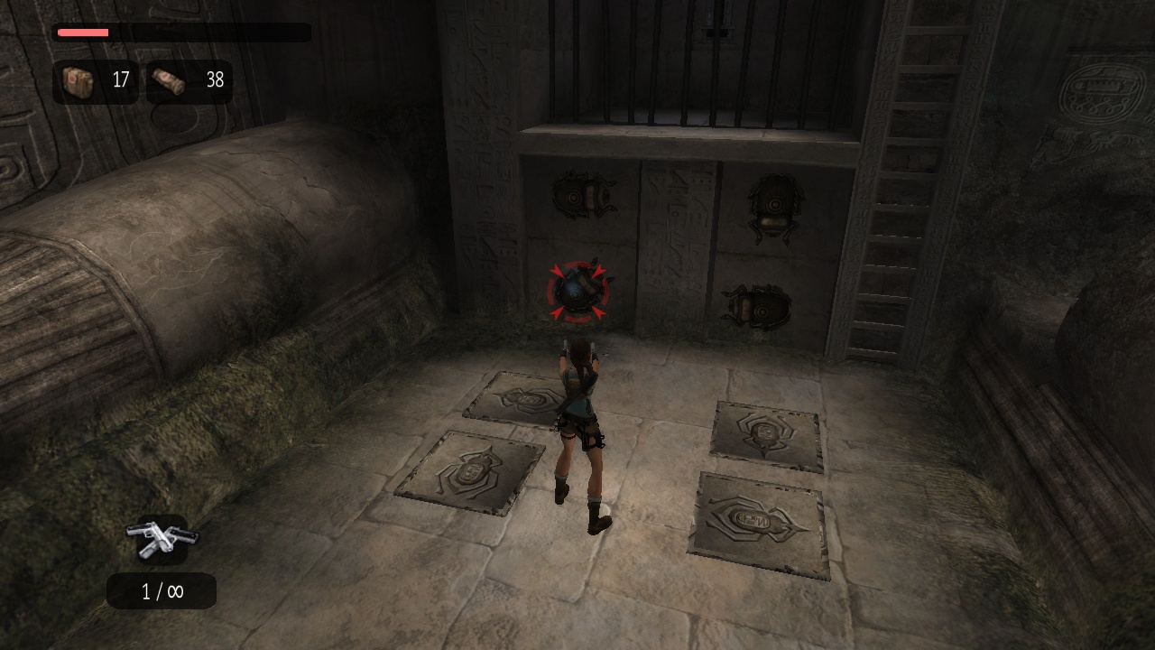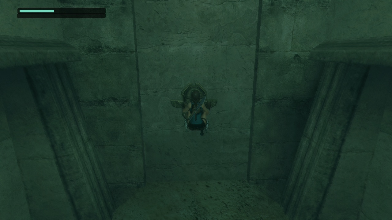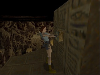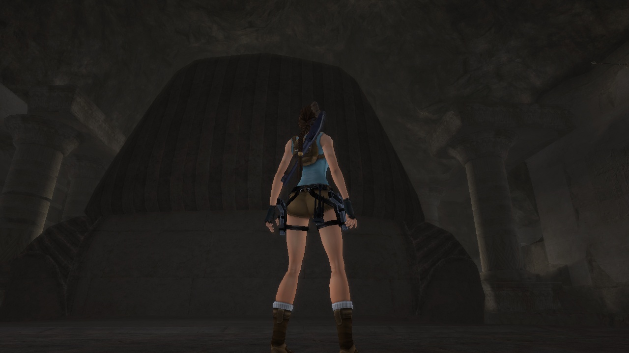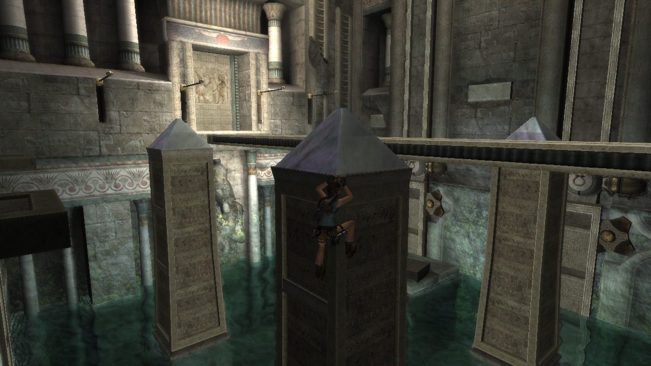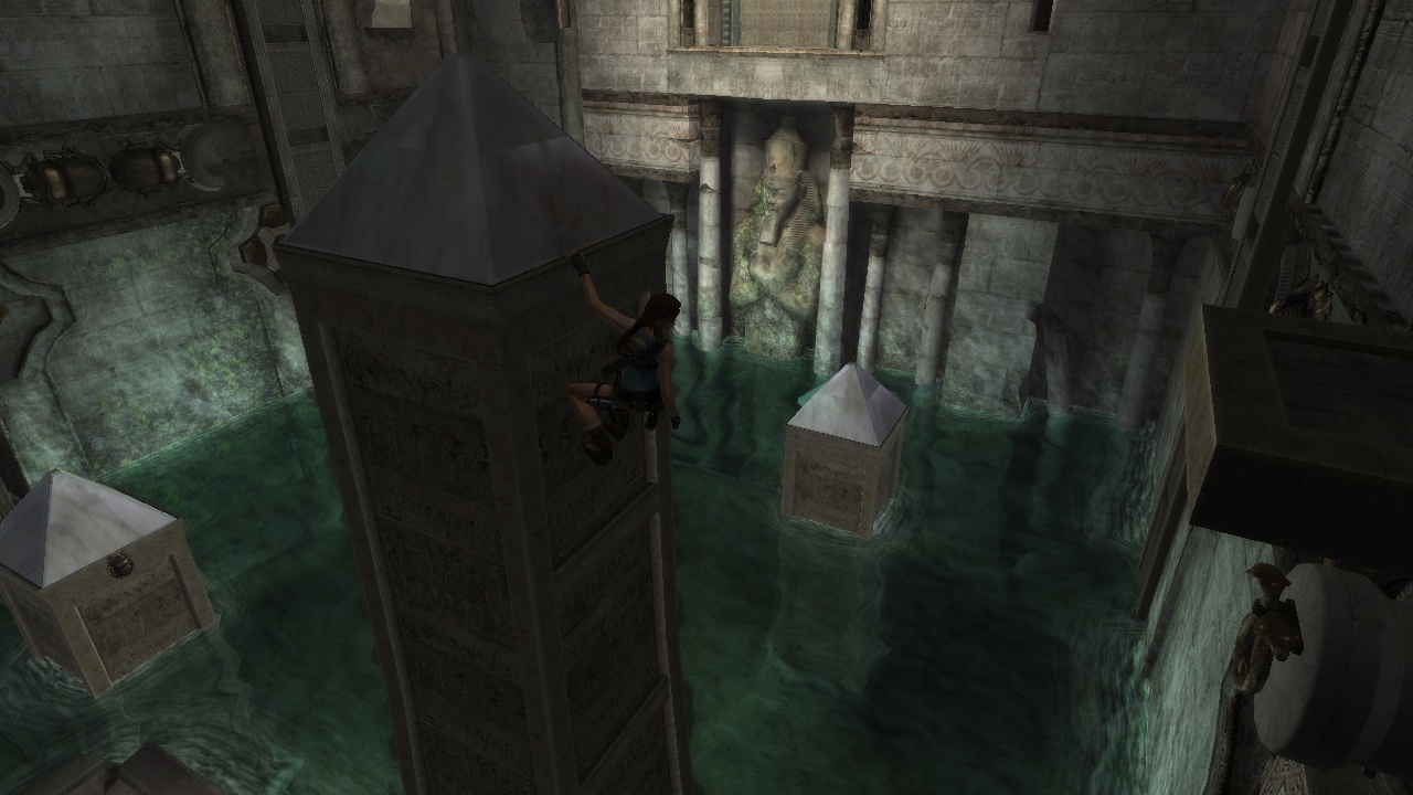 The passage beneath the sphinx leads to a huge flooded cave with statues of the Egyptian gods Horus and Anubis - which for some reason change places in between versions. Lara has to dive to the bottom to pull a lever, which drains part of the water. In the original the current takes her up into a room, which she climbs to come out above the heads of the statues. She then can climb back down carefully, or just leap into the water. In the remake, Lara instead stays below and has to climb up the statues, which is interrupted by two "puzzles" where she just has to shoot the scarab statues at the wall to match the decorated floor plates, which practically only exist to put the manual aiming to some use. |