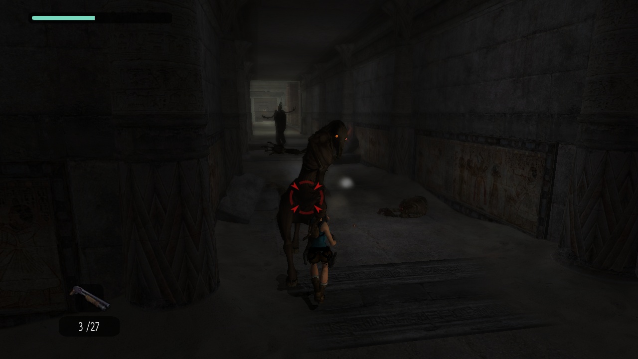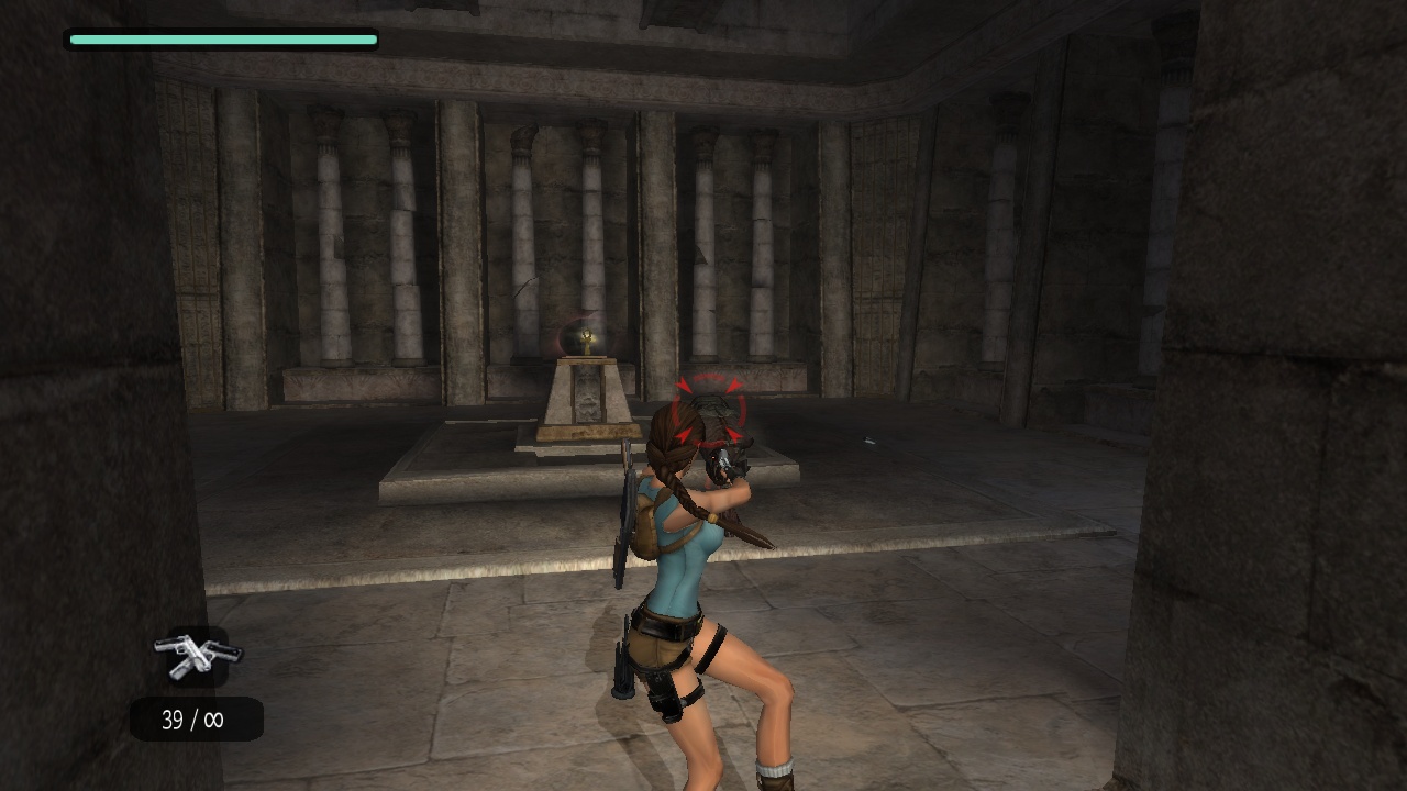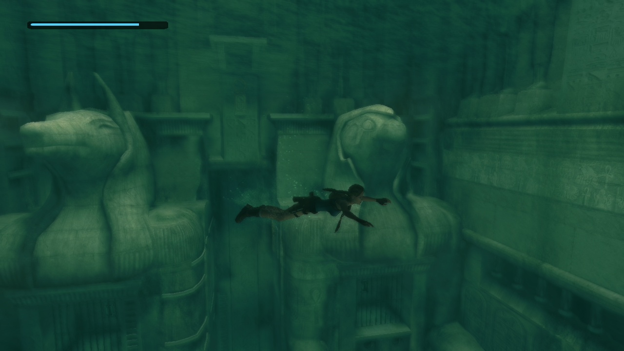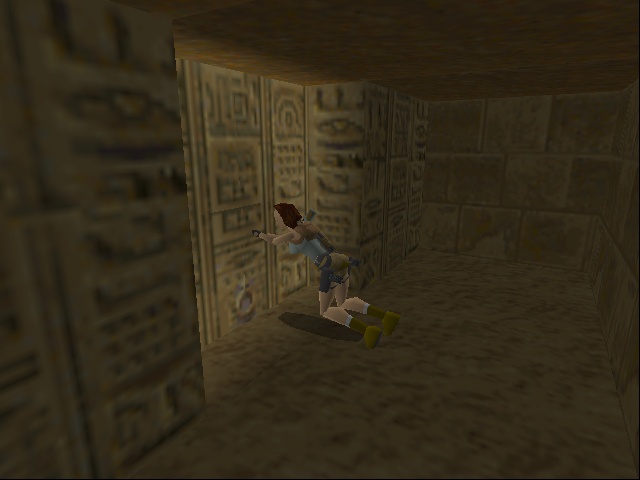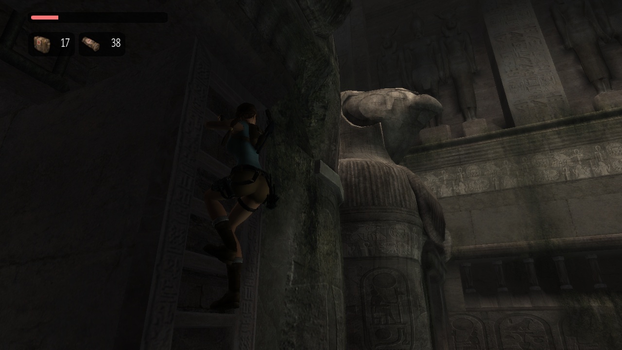 The passage beneath the sphinx leads to a huge flooded cave with statues of the Egyptian gods Horus and Anubis - which for some reason change places in between versions. Lara has to dive to the bottom to pull a lever, which drains part of the water. In the original the current takes her up into a room, which she climbs to come out above the heads of the statues. She then can climb back down carefully, or just leap into the water. In the remake, Lara instead stays below and has to climb up the statues, which is interrupted by two "puzzles" where she just has to shoot the scarab statues at the wall to match the decorated floor plates, which practically only exist to put the manual aiming to some use. |