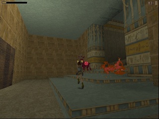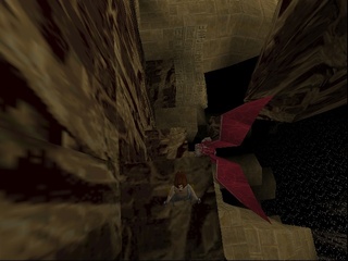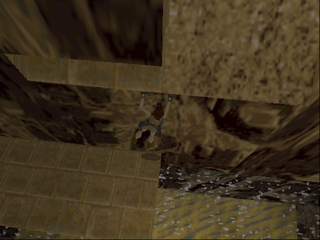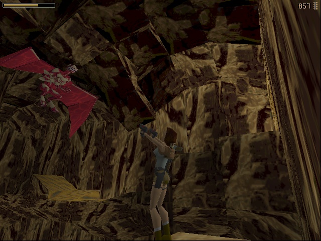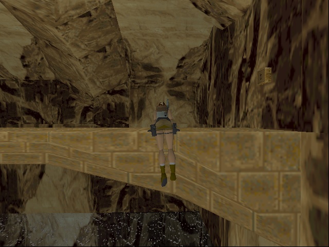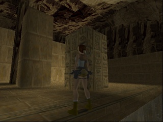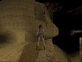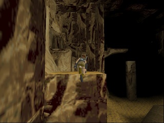 Then Lara has to push a TNT crate the longest way a crate ever has to be pushed around in this game in order to make it a platform, do some short but very difficult and dangerous platforming (difficult because it requires precise diagonal jumping, which isn't as easily calculated in the stiff Tomb Raider engine), pull another switch to somehow make the TNT crate blow up and open up a new passage. Next Lara has to fight the UZI-wielding kid goon on his skateboard and dodge a lot of magma boulders. Then follows a climb up some standard rocks and pushing a lot more blocks and pulling levers inside some clay structure. Anniversary drastically shortens this part, only including the climb up the stone wall. |