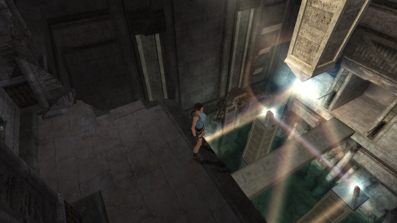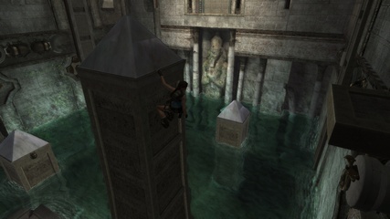 At the top of the cave walls Lara can find exits to two puzzle rooms. In the original Tomb Raider this means more typical platforming at one side and moving blocks at the other. Anniversary invents a new room where Lara can hang onto stone plates, climbing higher up as they descent into the water, until they get locked in place by scarab latches. This raises a set of pillars with pyramid tops, and only if all four are raised Lara can activate a mechanism that reflects light in between them to open the next door. It's an interesting change of the formula - at least the first time around, as the other side is almost exactly the same, only with a few of the platforming elements changed. In both games the ankhs that unlock the sphinx door are guarded by Atlantean creatures - centaurs in the original and mummies in the remake. |
