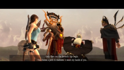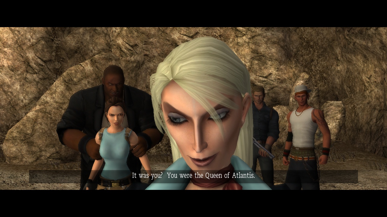 With the final part of the Scion, Lara heads outside to combine them. In Anniversary this triggers another vision of the old Atlantis, where the traitor queen is revealed as none other than Natla herself. This vision actually comes much later in the original - inserting it here provides at least an explanation why Lara lets herself get captured by Natla's henchmen like a putz and all her weapons taken away. Whereas her escape is extremely badly staged in the original - she just wiggles free without facing any notable attempt at stopping her and jumps down the canyon into the river below - the remake turns it into another quick time event where she evades the hoodlums' attacks. |