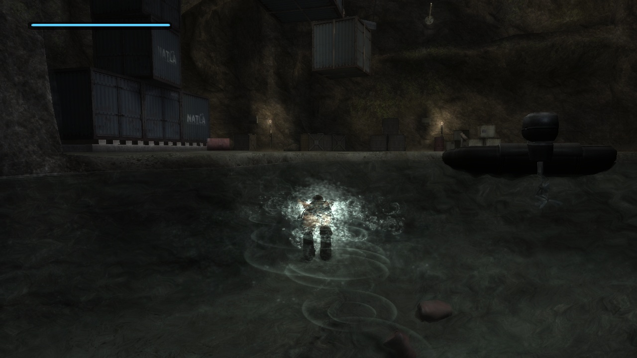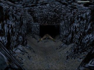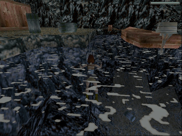 After leaving the ship, Lara finds herself in Natla's mines, where she starts out in another wet cave. In both versions the path is hidden behind the waterfall. In the original, Lara has to pull a switch there to open up a door leading to another switch back down below at the other side of the underground lake, which opens the door that lets her jump to the next area. At this point pulling remote switches to activate faraway mechanisms makes it increasingly hard to suspense disbelief, since Lara is now dealing with supposedly practical installations instead of ancient contraptions built to keep intruders away. Maybe that's why the remake replaces the entire sequence with platforming over some hanging crates to get up the waterfall. |