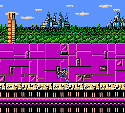 The game itself plays like most other platformers that involve a good deal of shooting, somewhat akin to a slightly slower version of Mega Man. Jake’s default attack is that of a psychic blast which he can shoot quickly for a single shot, charge a bit for a double shot, or charge until glowing for a penetrating triple shot. This attack uncannily resembles Mega Man’s mega buster, except this game was released a bit before the Blue Bomber received the ability to charge his shots in Mega Man 4. You can only fire charged shots from the ground, and you automatically release any shots the instant you jump, which can get annoying at times. There are some boss fights where the ability to fire a charged jump shot would be useful, as your regular shot is rather weak for damage. Even if charged blasts don’t work in the air, there’s still a helpful power working in your favor in the form of special magic. These twelve spells can be selected while you have the game paused and are used by pressing B while holding up, just like using subweapons in Castlevania. Every spell you use uses up either two or four notches of your magic meter, and it does not refill until the stage midpoint or end, so you must be judicious in your magic use.