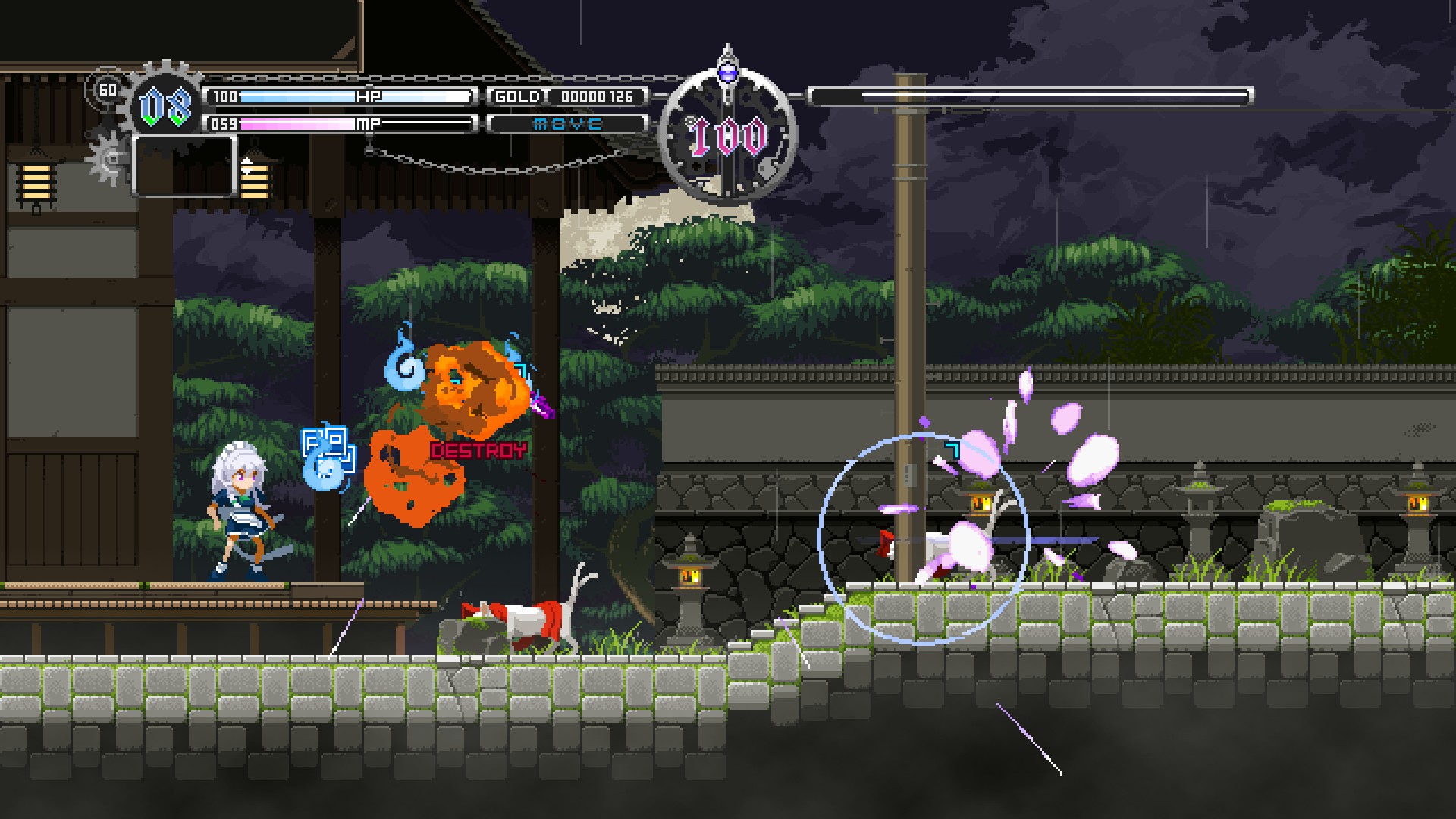 Compared to other Metroidvanias, the structure is pretty linear, and it’s hard to get lost. There are five stages in total, each with a boss fight, and each granting a key that can open up doors to other areas. You can revisit prior areas to use newly obtained skills to reach items you couldn’t before, though, and there are a whole lot of secret passages. In addition to a leveling system, there are lots of additional items to find, including HP and MP expansions, time extensions, and several special moves, some of which are almost essential for boss fights that it’s highly recommended to hunt them down. Destroyed enemies also drop a variety of colored gems – these will (very slightly) increase your stats, but you can also sell them to the shopkeeper Nitori, who will then allow you to purchase items like health or MP restoratives, among other helpful items.