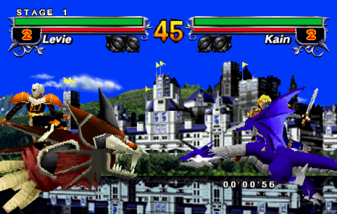 Despite being focused on flying creatures, the fighting is strangely grounded, as the dragons can’t actually move upwards or downwards. (For a more unique fighting game that actually allows character movement in all three dimensions, see Taito’s Psychic Force series.) While bother combatants are constrained to the same vertical axis, they can freely face away from their opponent and zoom around the arena, though this action is limited by a special gauge. The human characters can jump off their stead to attack, and can be knocked to the ground, where they’re left defenseless for a few moments before their stead dashes in to pick them back up.