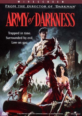 The movie poster for Army of Darkness is another play on the King of the Mountain trope. Not only Duke Nukem's personality is inspired by Bruce Campbell's greatest movie role, he also likes to pose in the exact same way. Given the tone of the game, it seems a little odd that they didn't trace over the hot chick that clings to his leg, too.