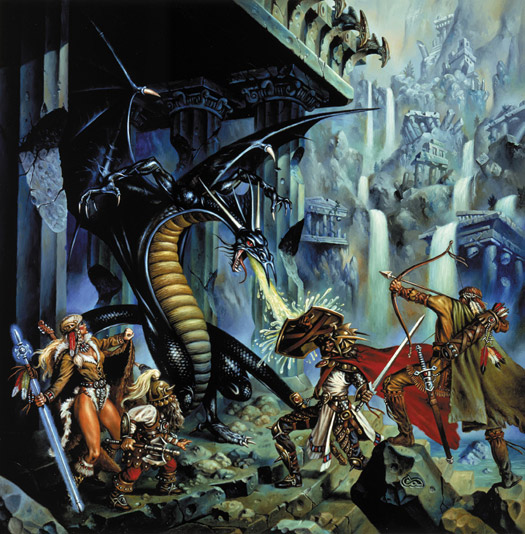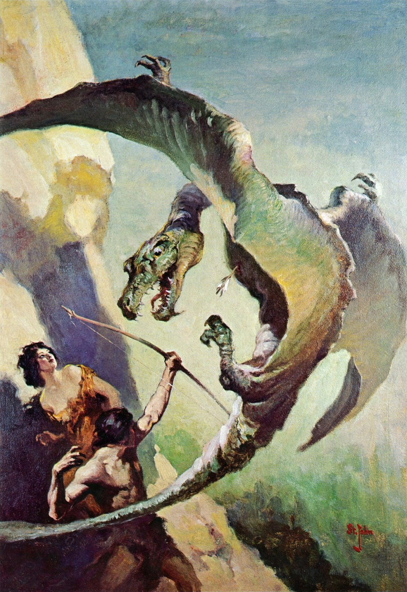 J. Allen St. John was one of the great early fantasy illustrators in the early 20th century and teacher to the famous Frank Frazetta. For video game artists, his art seems to have been a bit out of scope due to its age, but there's at least the title screen of Dragon Buster II, that looks a lot like the image of an archer he did for the novel At the Earth's Core by Edgar Rice Burroughs. The creature might have even inspired the dragon's heads, although the cover definitely comes into its own.