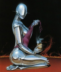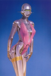 More Japanese-to-Western influences - Sorayama's sexualized female cyborgs have titilated game illustrators like none other, more often than not for games with erotic content of some sorts. Sometimes it's hard to tell whether an example was copied directly from Sorayama's paintings, or more loosely inspired by the general concept of a sexy Gynoid. Others are much more obvious...