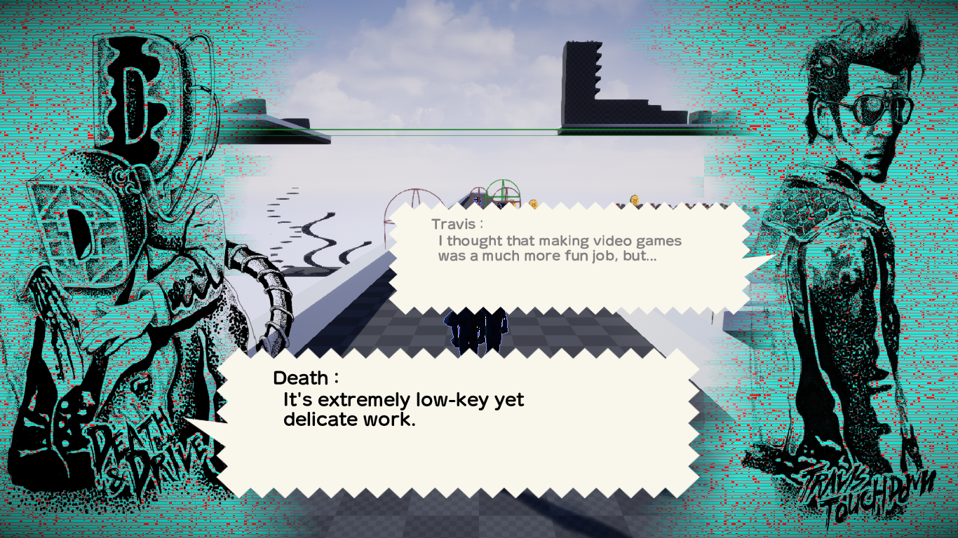 Travis Strikes Again uses a lot of metaphor, like most Suda games, but it’s a bit more blunt than usual. It’s a game where Suda is trying to express his frustration with the industry through Juvenile, while expressing what inspired him to enter this medium and what helped him come back through Travis. There’s a lot of introspective dialog from Travis, alone with his thoughts and musing over the medium he loves so much upon being forced to revisit it through the Death Drive, the first level ending with Travis killing his childhood gaming hero.
