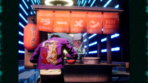 To balance things out is the Travis Strikes Back mode, old PC style visual novels Travis takes part in to collect Death Balls to unlock more levels. They’re filled with Grasshopper cameos, including interactions with major characters from Killer is Dead and The 25th Ward, where it’s often questionable how canon any of this is – if there’s actual logical canon between these games. Like, Travis’ cat talks in this mode and Travis himself is given a canon reason for why he’s aware of the forth wall and the specifics of how aware he is. Then there’s Bad Man’s true identity, an absolutely wild reveal in a seven day update with a new game intro that directly ties him to an obscure Japanese only Killer7 tie-in novel, one that actually gets hinted at based on how he says “Itadakimasu” when he eats ramen. No, really. That’s an actual thing in this game.