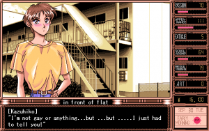 Each girl represents a different genre, following the usual lineup found in eroge games like teenage romance to kidnappings and dating your best friend’s underage-looking little sister. But sex isn’t as prevalent in this game as one might think going into it. Indeed, the humor and situations are often filled with sexual innuendo or heated situations, but sex itself only comes into play at the very tail end of the game when your focus is solely on one girl and it’s time to consummate your newfound love life. Very few characters of choice have more than a single sex scene, and the scenes are relatively tame and short compared to even the earliest of titles brought over to the US. This might have been why the game found success in the West, as it actually gave gamers a real chance to care and understand the characters they gravitated towards instead of just constantly clicking past the 100 or so penis metaphors the translators could come up with. As usual with these types of games, the scenes which the player goes through can be viewed again in a gallery mode after each play through. Even though he becomes a choice for the player to hook up with, Kazuhiko does not get any illustrated action, which apparently resulted in some complaints from homosexual gamers who felt the game should have equally shown what became of Daisuke and Kazuhiko once out of the closet. The Japanese release does not feature any additional story or illustration during this ending.