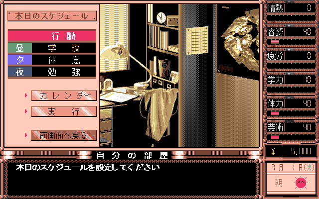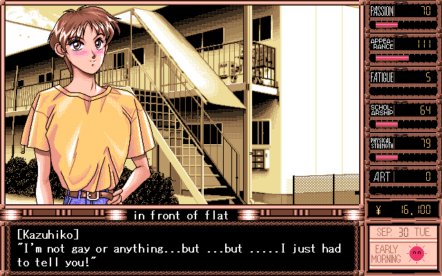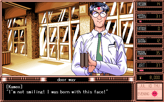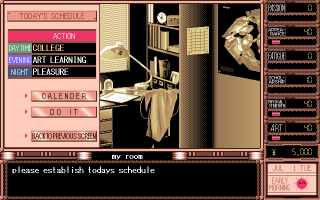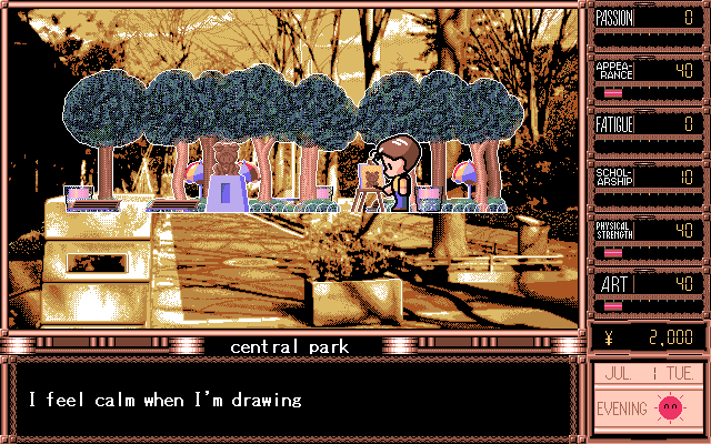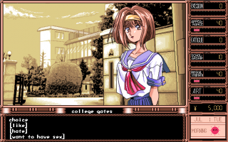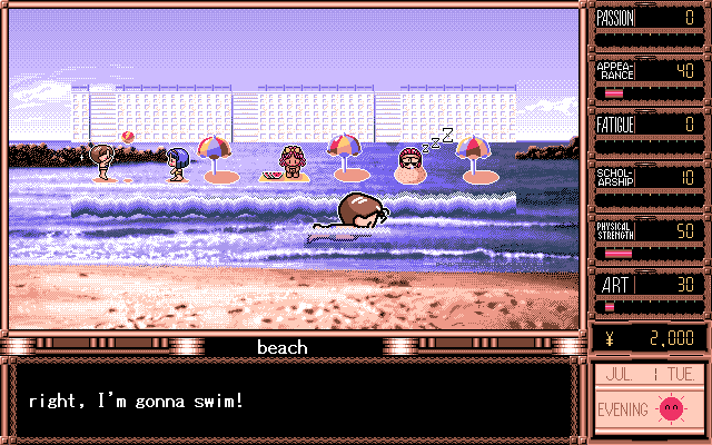 The game plays on a day-by-day basis with players having to schedule out the day. Per day, you have three action slots to fill out, though during school days, the day time slot will be College with no choice of skipping school. At your disposal you have Sports, Art Learning, Study, Break, Fashion, Shopping, Pleasure, and Work. All these choices affect Daisuke’s stats. The events of the game and the characters all relate to you based on these stats, similar to how stats in RPG games work. To make things more interesting, these different actions will all affect one another, leading players to put some thought and strategy into their schedules. Sports will improve your appearance and physical condition, but will affect your fatigue and scholarship, while studying will raise the scholarship stat while decreasing the physical condition and appearance stats. Therefore, the player needs to find a balance to things and figure out the best weekly schedule to improve the desired stats. As mentioned before, at the beginning of the game you are given a choice of what kind of personality Daisuke has. This choice doesn’t affect his behavior in the game, but rather affects the scheduling and starting stats. Players must also be cautious of the Fatigue stats, as it will cause you to collapse and lose several days’ worth of character building.
