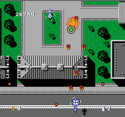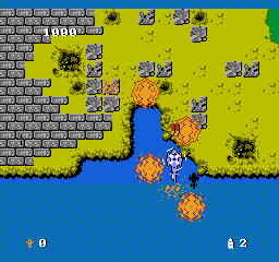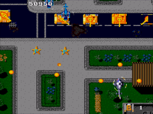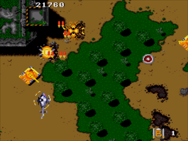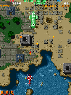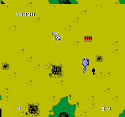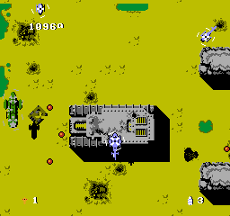 There are actually some slight differences between the North American port (distributed by Romstar) and the Japanese version. The North American version offers two player simultaneous play and instant resurrections, instead of checkpoints in the Japanese version. Your helicopter is also a bit faster in the American version, but you can only have three shots on the screen at once, compared to four in the Japanese original.