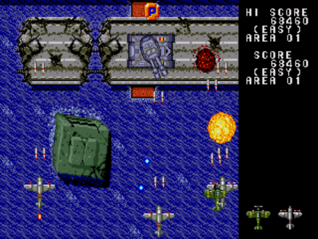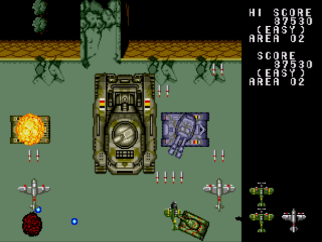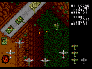 The Genesis version has some graphical downgrades in order to fit it into a cartridge, but the sound remains perfectly intact and is the best home version. Like the port of Truxton, the right side of the screen is devoted to a status bar. Daisenpuu was ported to the PC Engine twice, first on a HuCard, and later on CD-ROM. On the surface they look identical, with some slight graphical dowgrades again, although the visuals take up the full screen. The sound takes a hit too, but you can still recognize everything for the most part.