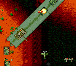 But the CD-ROM port is, strangely, inferior. Probably due to the limited RAM of the PC Engine and the inability to stream data, the levels are no longer continuous, but are instead broken down into areas. On the plus side, that means brand new bosses at the end of each stage. On the downside, many background details are removed. For example, in the first stage there’s an area where tanks are supposed to be driving over a bridge. Apparently those tiles couldn’t fit into memory, so now it looks like they’re part of a canyon. Later on, you’re supposed to fly over an ocean. That doesn’t happen either – this particular section looks like the rest of the stage now. Some enemy patterns have changed, some sections are added or missing. Even the explosions are missing animation frames and look kinda bad. Other than the bosses, the only advantage is the CD audio music, which isn’t terribly good anyway.