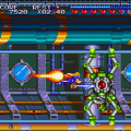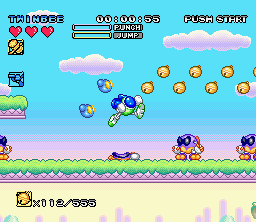 The gameplay follows the genre’s rules that were established by Super Mario Bros. Enemies can be killed by jumping on them, or by attacking them with one of your weapons. There are two charge abilities – by holding down the attack button you can unleash a super punch, while holding down the jump button will activate a rocket boost that will send you dashing in any of the eight directions. The flying mechanics work similarly to Konami’s Rocket Knight Adventures, where you can bounce off walls and ceilings chaotically. One of the biggest differences is that you can boost infinitely, without having to touch the ground. A few levels don’t even have ceilings, so you can continue to rocket upwards, out of the stratosphere and into outer space, with a gauge indicating how far you are away from the surface of the planet. There’s nothing up there, but it’s really cool to try! It does come with a few quirks though. Since the dashes are charged by the jump button, you can’t jump and then boost, making it somewhat hard to aim. Some stages are also set up with “gotcha” obstacles, like spikes that are impossible to see before you collide with them.