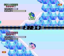 The Japanese version of the game has a battery backup that keeps track of your progress, like the best time for each stage, fairies collected, etc. This is important, as there are different endings depending on your performance. The European version uses a password system instead, which doesn’t keep track of any of this additional data, leaving it with only one ending. The map screens are also different. In the Japanese version you can choose stages in a non-linear manner, as completing a level will unlock the stages surrounding it. In the European version, progress is completely linear. There’s also some text in the Japanese version, mostly conversations with the cast and Dr. Cinnamon before entering a level. Most of this has been cut from the European version. There’s a fan translation patch for the Japanese ROM which lets you play the game entirely in English, so you don’t have to deal with the downgraded European version.