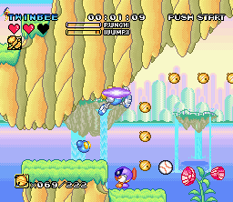 You have a life meter, consisting of three hearts. Each level is filled with tiny bells, and collecting 100 of them will regenerate a heart. Destroyed enemies will also drop larger, colored bells, which will grant power-ups. These include equipping your character with their signature weapon: a pistol for long distance attacks, the classic shield, invincibility time, shoes to stomp harder, bunshin Options, and homing missiles. Getting hit will cause you to drop all of your colored bells and lose these power-ups, though they can be regained if you pick them up before they fall over the screen, Sonic the Hedgehog-style. There are also hidden sprites, usually a few in each stage.