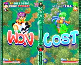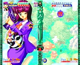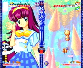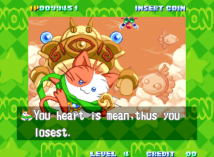 Naturally the gameplay is what really makes the game standout, but the look and feel of the game is part of its charm. While the basic gameplay graphics aren’t much impressive, everything else is bright and goofy, set to an impossibly upbeat soundtrack and populated by strange characters with even stranger motives. Some of the oddballs you’ll encounter include a rather effiminate knight named Arthur Schmitt who enjoys riding on his rocket, a group of colored fluffballs who call themselves “Nanja Monja” and really hate girls who wear red, and a midget cat named Kim (“Do Kesubei” in the Japanese version) who rides a giant robot, speaks in olde English, and is a terrible letch. Adding to the charm is the utterly atrocious (and typical of Neo Geo games) translation, which when not spelling words wrong, creates some of the most hilarious innuendos to come out of video gaming.
