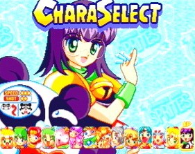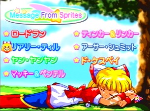 The most complete port was for the Sega Saturn – ADK really went overboard in adding extra stuff to it. In additional to the rearranged music, there’s an anime intro (complete with sugary vocal theme song and a Sailor Moon-esque transformation), full voices for all of the cutscenes, extra dialogue for all of the other characters (since the Story mode only focuses on Ran), a handy rapid-fire button, the ability to carry over your power meter after dying, and extra little graphical tidbits here and there. There’s even an entirely new character, the purple-haired Chinese girl Meirin, who attacks with her goofy panda-face things and cosplays during her bomb attack. There’s the usual slowdown and brief loading times between stages, and the sound effects are pretty low quality, but otherwise it’s quite awesome. Really, the only thing lacking is an English mode. As a bonus, the Saturn version includes a fan disc, full of artwork (both fan-made and official), a karaoke, and “messages” from each of the characters. It’s only really for the hardcore Twinkle Star Sprites fan, so if you stick with other versions, you’re not missing a whole lot. Screenshots for these are below.
