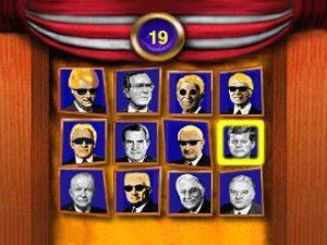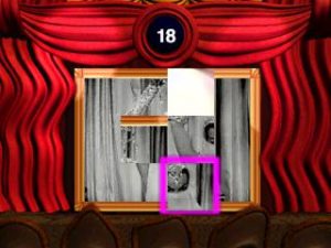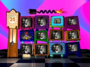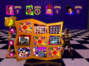 Most of the time, however, you’ll land on one of several minigames, successful completion of which will allow you to take another turn. Compared to later games in the genre, however, almost all of these minigames are puzzles, only rarely calling on any reflexes. You’ll find matching games of both the image and sound variety, or sliding tile puzzles involving both still images and public domain footage. There’s also trivia, which can be set to three different difficulty levels or disabled entirely. There’s no shame in that last option, since the trivia goes so deep into ‘90s pop culture, politics, and other contemporary subject matter that most players nowadays will be completely lost. The most action-oriented the game gets is “Zapper”, in which you have to quickly maneuver a crosshair across a screen of TVs, selecting the ones that start playing commercials to prevent a fuse from running out.