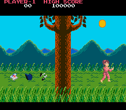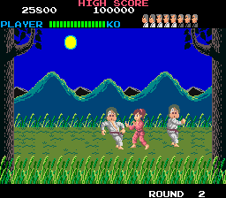 The game starts by showing Yuki approaching a tree in a schoolgirl outfit. She disappears behind it, her clothes fly off to the left and she emerges in her pink gi, ready for battle. The odd-numbered stages take place in a dojo, where the boss of that level sits while you defeat his grunts before engaging you himself. The even number stages throw two opponents at you at a time, forcing Yuki through a gauntlet of between eight enemies per stage. Stages two and six occur outside in a grassy field, while stages four and eight occur before a Japanese building. Most stages are palette swaps of the others.