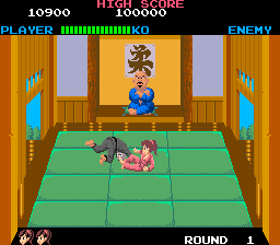 This game hails from 1985, an era before the fighting game genre was established with Street Fighter II, with its contemporaries including games like Data East’s Karate Champ and Konami’s Yie-Ar Kung Fu. Even in this context, Typhoon Gal plays differently than these, given its focus on judo. There are two buttons, attack and jump, and various unique moves can be used in tandem with a joystick direction. Yuki can push away her opponents to line up her kicks, elbows and punching. The jump button can be used to perform headbutts and various throws, in addition to a very high jump. No opponent in the game can be beaten without throwing them to finish them off.