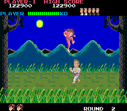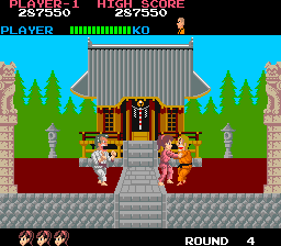 Most of the grunts look similar, sharing only a few different heads and different colored outfits, but the bosses have unique designs. Bocher (Round 1) is a blading chin beard fellow in blue while Hogen (Round 3) is clearly influenced by Hulk Hogan with long blonde hair. Dumpling (Round 5) wears yellow with either blue hair or a turban, and Franky (Round 7) is a muscular version of Frankenstein. While each boss has more health, their move sets don’t vary from the standard opponents, so you can beat them the same way. There’s no ending, as the game restarts at a higher difficulty once you complete the game.