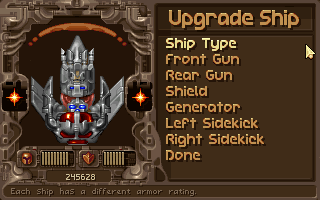 The real attraction of the gameplay is the amount of customization afforded to you: between stages in Tyrian‘s “full game”, you’ll visit a shop where you can replace or upgrade your ship’s equipment. Your ship comes equipped with four weapons systems: a Front weapon, a Rear weapon, and a pair of “sidekicks” – small independent ships that float alongside you. The Front and Rear weapon consume energy when they’re fired and can each be upgraded a number of times; how fast your energy replenishes depends on your ship’s generator, which can also be upgraded.