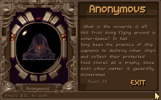 You’ll be piloting this heavily-customizable ship as Trent Hawkins, scoutship pilot and terraforming engineer, as he battles the evil corporation Microsol (which, of course, bears no resemblance whatsoever to a certain purveyor of operating systems in Washington State…). The game is split into five “episodes”- when the game was originally released, it included only the first three episodes; episodes four and five were each provided in a later release.