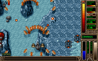Set in a faraway star sector, Tyrian is a fairly generic sci-fi-themed shooter on the surface. You’ll pilot your ship through a wide variety of vertically-scrolling, parallax-rendered environments. While the hand-drawn graphics are relatively low-resolution, they have aged fairly well, especially when compared with the early-CG-rendered style that was in vogue at the time. The game also features some frequent transparency work, used to render translucent clouds and vapor trails, colored filters, or dark stages. The overall effect is fairly satisfying.