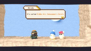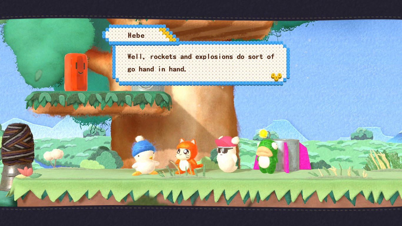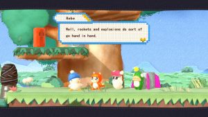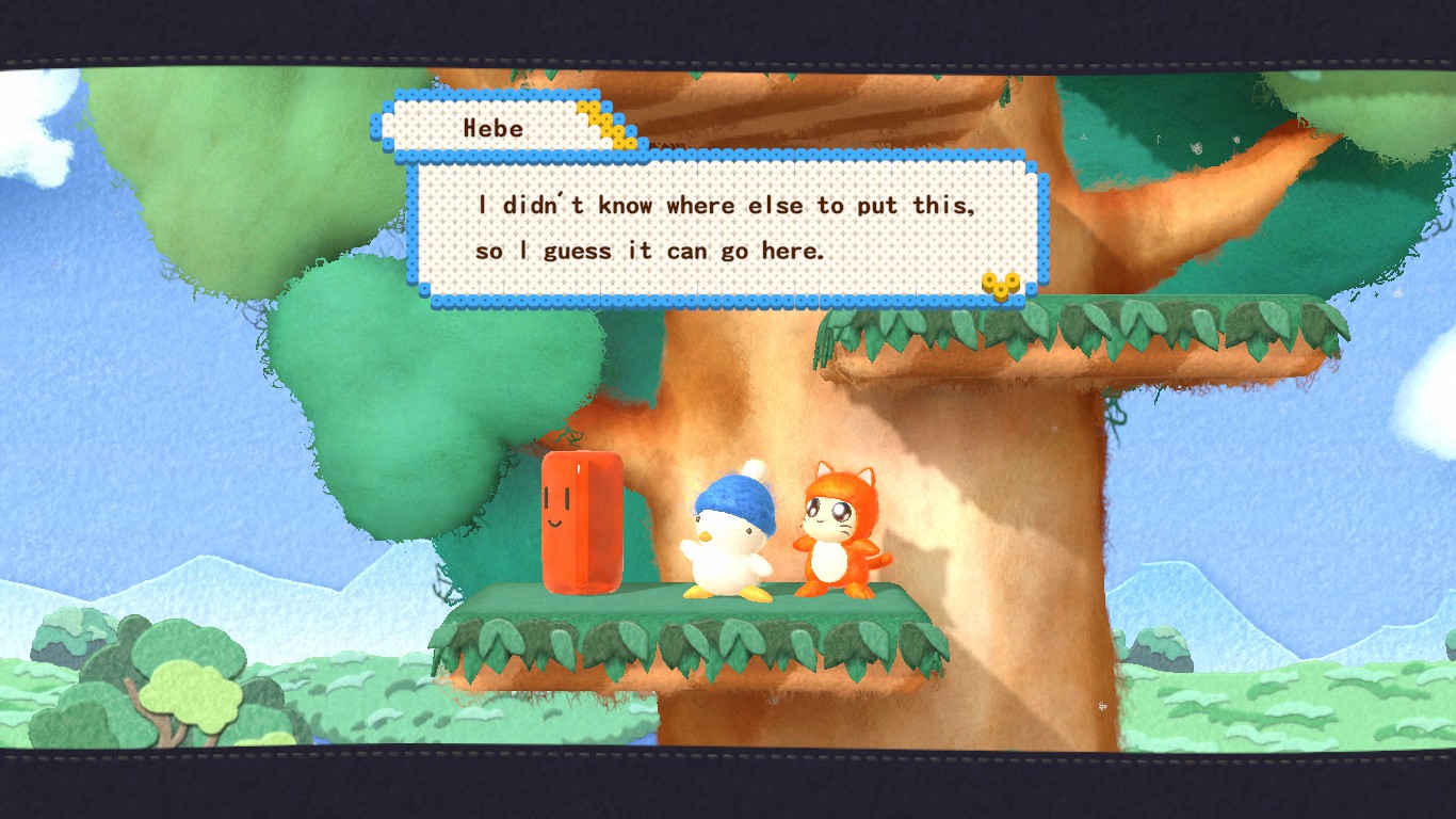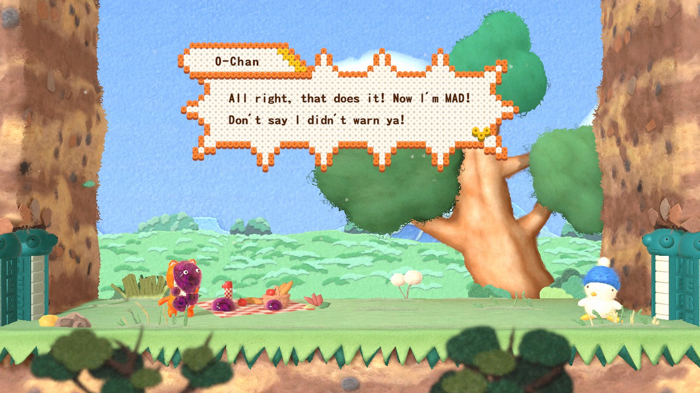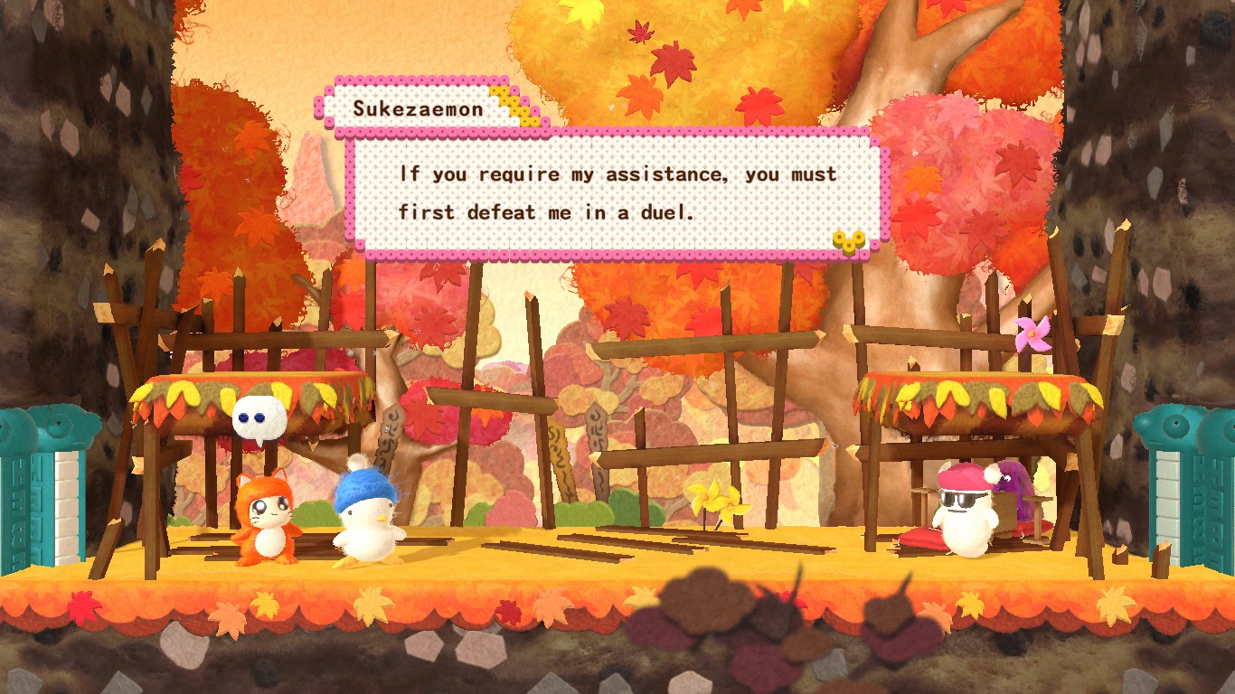 Still, this game has an undeniable charm. The 1990s pixel sprites have been replaced by 3D models looking like they are made of felt, clay, plastic and other materials used for handcrafts, while the stages seem made with painted cardboard. Everything looks like moving dioramas and some areas like the autumn-colored forests are definitely pretty to look at. The character portraits appearing in the corner of the screen are lifted from the pixelated ones of the old games, but they look like they have been crafted with perler beads, as are the menus. The soundtrack is mostly made of rearranged tracks from the 1991 game but, since those were generally excellent, that’s a good thing, and the new tracks still fit perfectly with the tone and style of the game. And all the dumb noises our quartet make are sure to put a smile on anyone’s face. There’s even a nod to the Western localization of Hebereke with surprise cameos of Bop-Louie and Freeon-Leon, randomly replacing Hebe and O-Chan during the trips back home! Sadly, they haven’t been made playable.