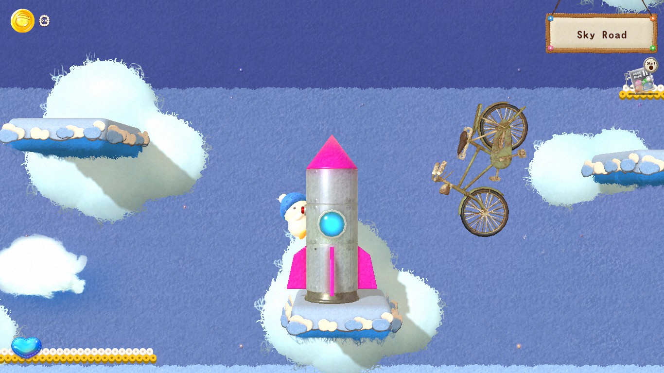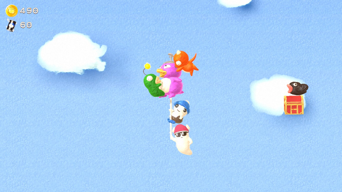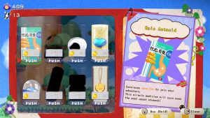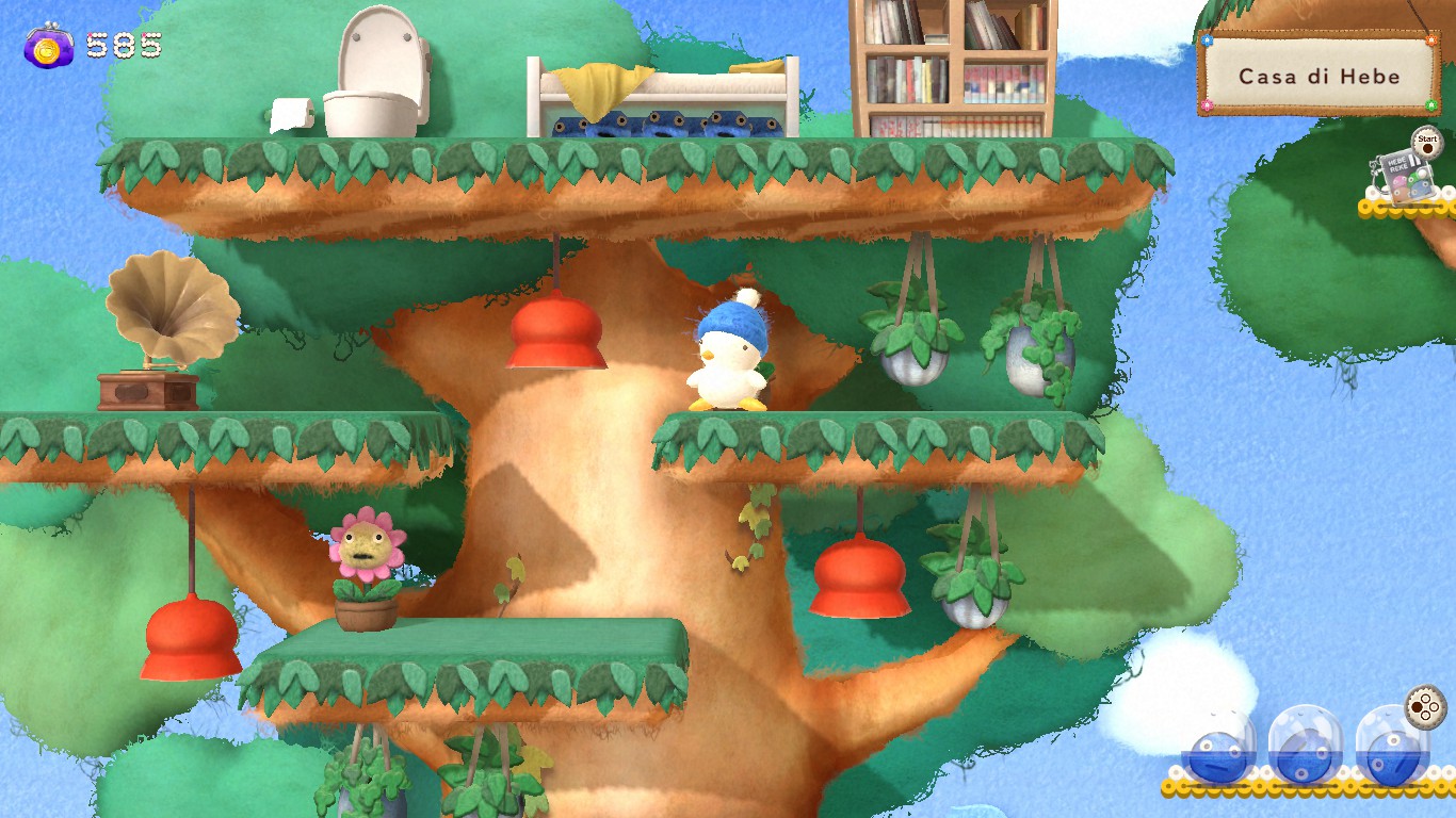 The main hub is Hebe’s house on a tree (little more than a bed, a toilet and some sparse furniture), which has a vending machine under it. Said item shop holds every kind of trinkets, but even in a bizarre world like this one you still need money to buy products. So, Hebe has to pick the coins and chests found everywhere like he’s in a 1990s collect-a-thon platformer, in order to buy stuff that will make his trips easier: from a world map to fast travel, to abilities either universal (crawling, wall climbing) or specific to certain areas (solid clouds, a minecart).