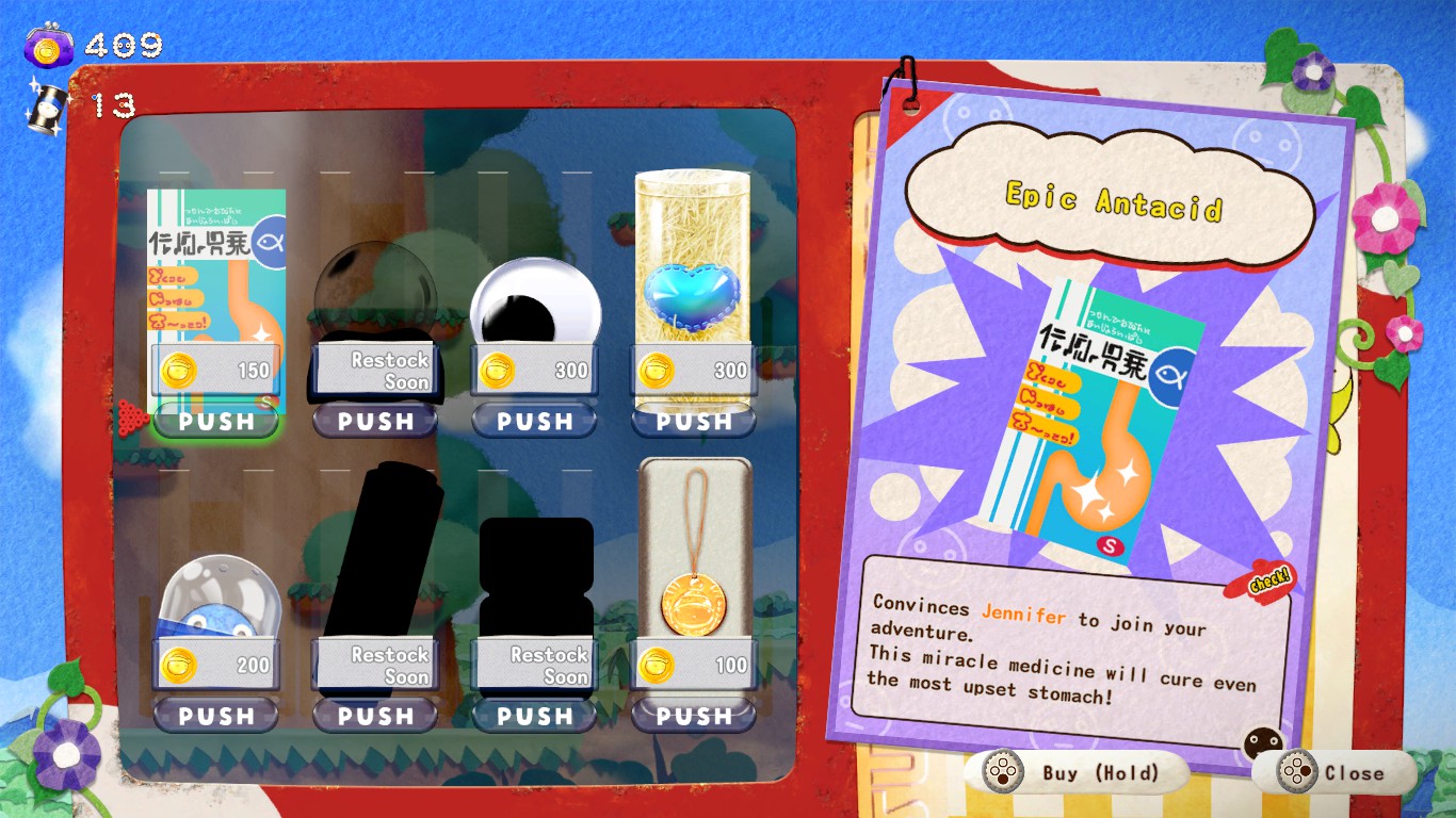 The “rogue” part of the gameplay is also limited at best, since stages are not procedurally generated, but are a pool of 3-4 courses for each zone randomly chosen every time; given how many times you will have to revisit them in order to buy all the necessary stuff from the item shop, one will have seen everything the game has to offer two or three hours in. And with how easy and short the stages are, plus how simple it is to stock on cans (optional challenges are ridiculously easy) and gain money by rematching the bosses (our friends included) over and over again, it all feels like busywork after a while, especially since a few important items are hidden behind useless ones that only provide cosmetic enhancements. Obtaining everything from the shop will take no more than six hours, and even that time feels artificially stretched. Not to mention that the character’s abilities (O-Chan’s ice breath, Jennifer’s vomit bombs, etc.) are buyable items this time too, meaning that they aren’t mandatory and only needed to reach cans and chests; but, since these are so easy to find anyway, one could go through the whole game without ever having to use them and only collecting them for achievements.