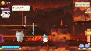 Enemies (all lifted from the first Hebereke) are sparse and mostly wander aimlessly back and forth, bosses are all the same basic template and are all defeated with three head stomps, often in a time shorter than the victory fanfare coming up afterwards; the game is also really generous with life-restoring and life-enhancing items (there’s even a convenient vending machine before every major battle) and there are no really dangerous traps outside of some easily-avoided lava pools (Bumyon are little more than a nuisance, despite being presented as a threat). You can save at any time when you are in the hub area, and everything is also really linear and railroaded, with the pause menu helpfully pointing out where to go and what to do next. Also, sequence breaking is impossible because the guy who restocks the vending machine (the only character exclusive to this game) only provides the plot-important items when the story calls for it, regardless of how many coins and cans you have in your pocket.