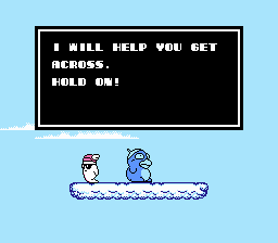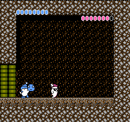 Hebereke, the game that started it all and made Hebe Sunsoft’s mascot, was named in the Western world with a pun on “UFO”, “utopia” (or “euphoria”?) , and “four” as in the number of playable characters, plus the meaningless subtitle “The Saga”. The plot is mostly nonsense in both the Japanese and Western versions, involving distortions of time and space. The latter version simply states that Bop-Louie’s friends fell down a crater and found themselves in a strange new world. He follows them down and, whenever he finds them, must beat them in a fight because they’re amnesiac. At that point they will join him, becoming selectable in the sub-menu.