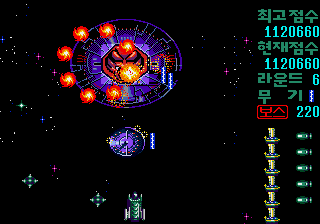 These make Uju Geobukseon a somewhat functional shooter, but the game itself remains sloppy and unforgiving. The turtle ship is a bit huge and slow to effectively dodge everything, so it’s too easy to accidentally run into enemies and lose your weapon, especially when the game likes to send blazingly fast ones after you at times. There’s barely invincibility time after damage, so extended collision with anything can potentially kill you in a second. Upon your defeat, the game removes all your power-ups and sends you back a small distance. This can put you into aggravating situation hard to get out of, since your ship is incredibly pathetic on start, and most of the stages are designed under the assumption you’re strong enough to erase dense bullets filled on the screen. Setting difficulty to the lowest doesn’t much ease them off.