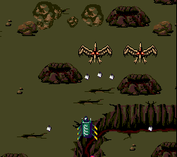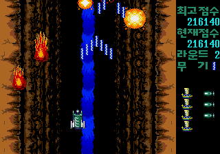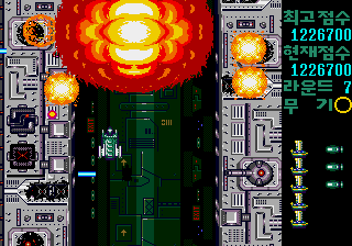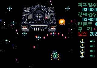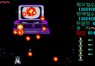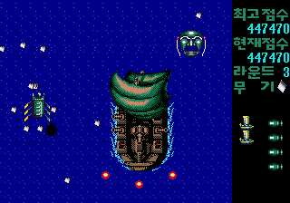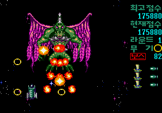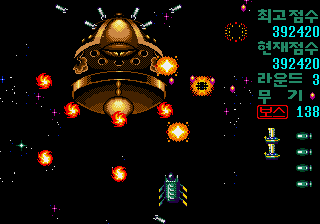 Uju Geobukseon is technically pretty short, clocking around 30 minutes to finish a total of 8 levels. Oddly enough, the first one takes place in Mesozoic era plateau and pits you against a herd of pterosaurs, an opening act that maybe fits better in The Magic School Bus. Unfortunately, the game doesn’t come up with much of anything to keep the levels visually attractive – the parallax scrolling in stage 2 is probably the most gorgeous thing it can show you – so you’d better get used to ugly browns and blues that plague the entire game. Regrettably, despite the classical Asian motif shown in the intro, that idea never truly comes into play. Only one level ever exploits it, which features castles and villages from Joseon dynasty. It doesn’t go well with the sci-fi setting, but at least it’s original. The rest of the game is spent in uninspired city warfare and space battle, with some bizarre objects like kites, giant swords, and bouncy balls (?) occasionally replacing the aircrafts.