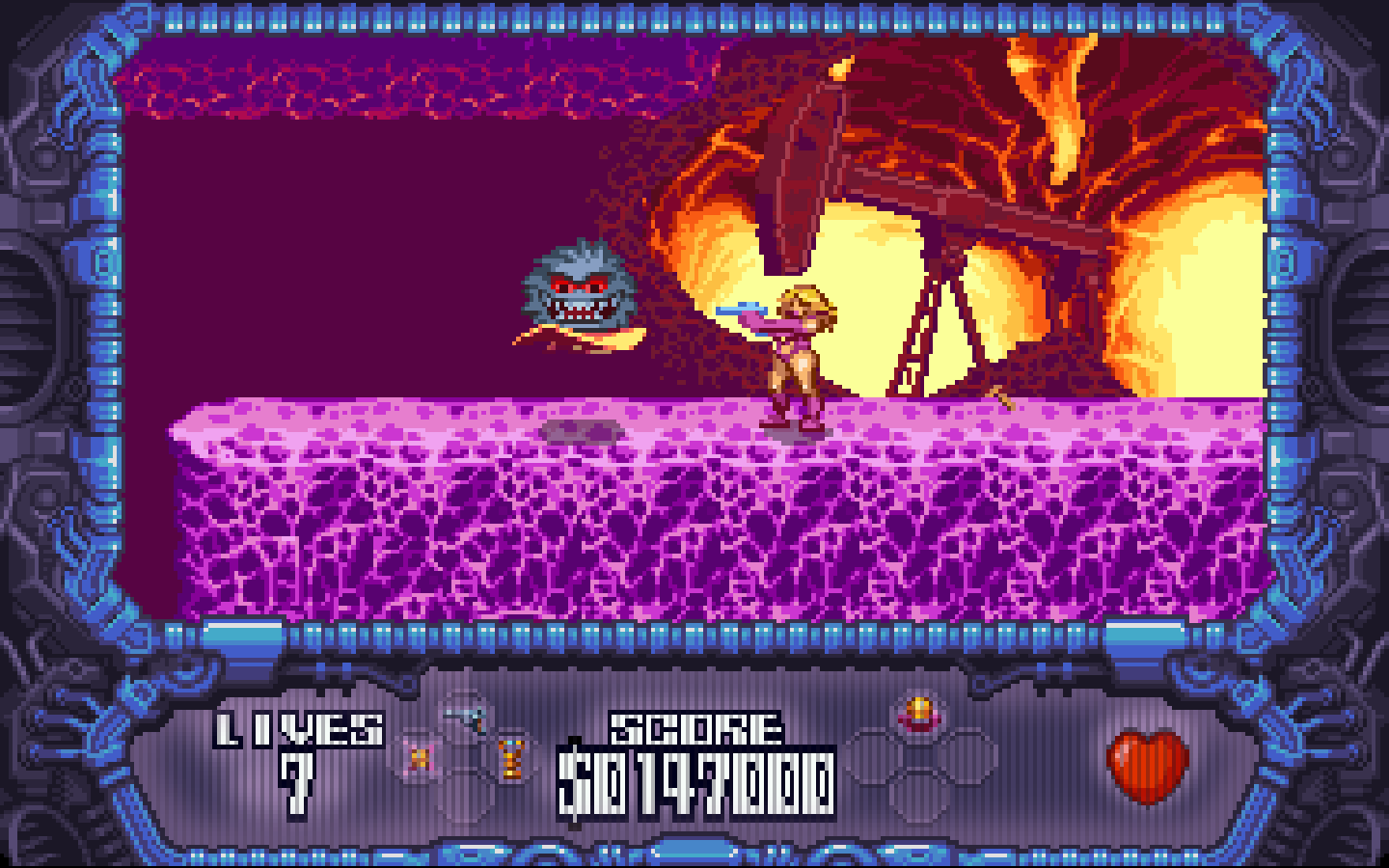 Serena also has a few tricks up her sleeve via some upgrades that can be purchased throughout the game. These can be found in shops that have to be unlocked by finding a coin hidden somewhere in four of the game’s levels. Each upgrade can either allow Serena to take extra damage or drastically improve her laser gun. Some of the levels are actually fairly straight forward, and poking around trying to find both the coin and shop in each one (along with fighting more enemies to earn enough points to actually by the upgrades) adds a light exploration element to the game reminiscent of Turrican and other side-scrollers in the 80s and early 90s but often missing from the nostalgic modern games they inspire. The number of upgrades is also higher than the number of times one as the opportunity to purchase them, meaning players can change the feel of the game depending on whether they want to prioritize more firepower or better defense.