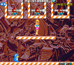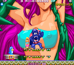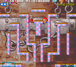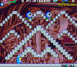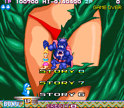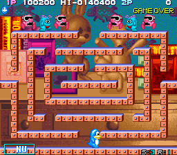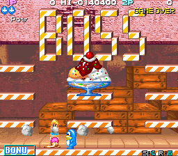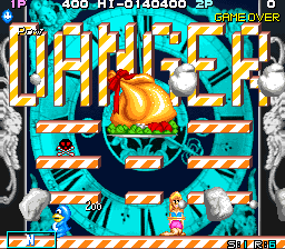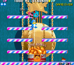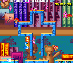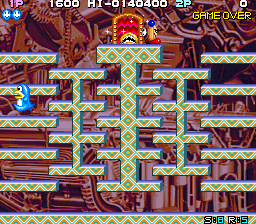 This game is really pretty fun. It's also quite frustratingly designed. Nearly all of the enemies will jump whenever you try to blow a bubble, which means they'll land on a floor above you, requiring you to chase them down and probably get killed. ARGH. Many of the enemies are infuriating, too, especially the stupid clocks which will randomly stop still and project sonic waves. They also make some of the most incredibly annoying noises to man. Actually, most of the sound effects are just as annoying, especially your "death/restart" sound, which sounds like a demented crow.