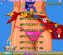 Anyway, on to the game. Aaaand it's Bubble Bobble, except done like Parodius, right down to the penguin-as-a-main-character motif (they even look identical) and the rampant use of "classical" music from the public domain. It has enemies that capitalized on the then-megahot trend of wearing basketball goggles. REMEMBER THE BULLS. Anyway, it's such a blatant rip-off of a popular game, from a fly-by-night company that had absolutely no ties with Taito, using character designs by Famitsu artist Susumu Matsushita, which, given this situation, may or may not be bootlegged.