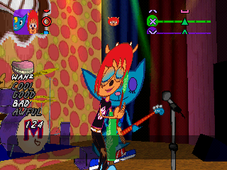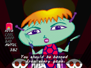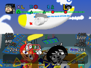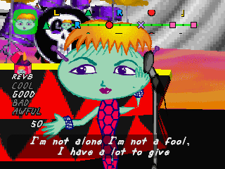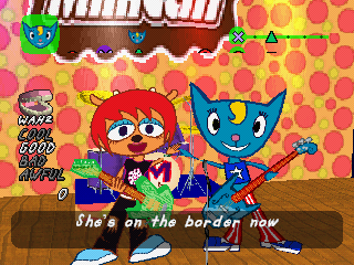 In addition, your rank changes if you pull off or screw up any two lines in a row, instead of the “first line in a pair” system used in PaRappa. This does make things more difficult in some respects, but it also allows you to recover more easily. From stage two onwards, you’ll unlock guitar modifiers after beating each stage, such as distortion, reverb and a harmonizer. These can be toggled by pressing Select, though they don’t do much else besides giving you extra incentive to replay stages.