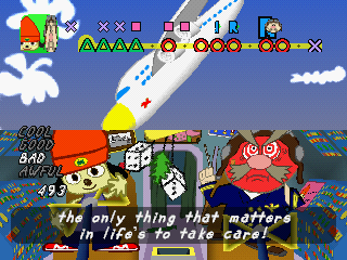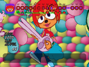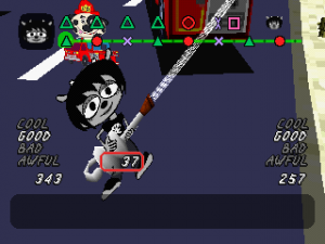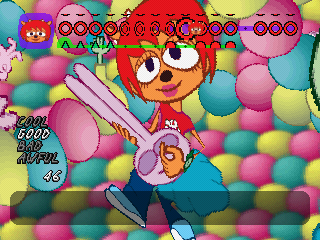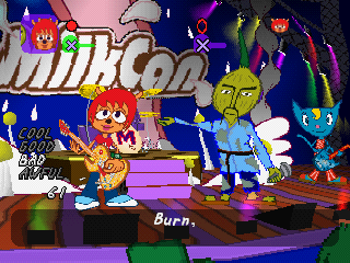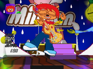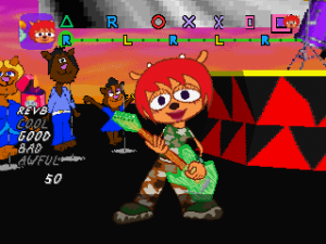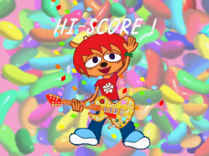Of course, all this wouldn’t be worth much if the music wasn’t any good, but it’s quite excellent. Since you’re using a guitar, Lammy goes for rock for its musical direction, and does wonders with it. Each stage focuses on a different type of rock from 60s pop rock to funk to even thrash metal, and they all use the strengths of their genres to create memorable and compelling challenges for you to tackle. The guitar lines you play and improvise sound so satisfying to play, and they work impressively well within the chopped up parts. While perhaps not as catchy as PaRappa‘s tunes, the soundtrack is still a delight and the composers (Masaya Matsuura, Yoshihisa Suzuki, and Shigeyoshi Kawagoe) deserve praise for their efforts.