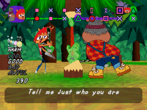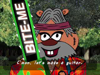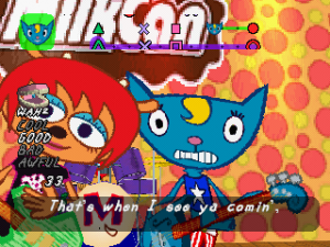 Um Jammer Lammy features the same gameplay as PaRappa in that you repeat lines given to you by your “teacher”, though you play them on guitar instead of rapping them. While mostly the same, there’s a handful of tweaks that have been made. For starters, the line at the top of the screen has been modified so you can see exactly where the teacher’s lines and your lines are, which makes it easier to see when it’s your turn and to prepare for it.